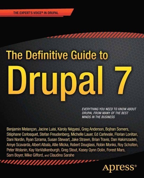 The Definitive Guide to Drupal 7 was written by the following team of expert Drupal authors: " Benjamin Melanc on, Jacine Luisi, Ka roly Ne gyesi, Greg Anderson, Bojhan Somers, Ste phane Corlosquet, Stefan Freudenberg, Michelle Lauer, Ed Carlevale, Florian Lore tan, Dani Nordin, Ryan Szrama, Susan Stewart, Jake Strawn, Brian Travis, Dan Hakimzadeh, Amye Scavarda, Albert Albala, Allie Micka, Robert Douglass, Robin Monks, Roy Scholten, Peter Wolanin, Kay VanValkenburgh, Greg Stout, Kasey Qynn Dolin, Mike Gifford, Claudina Sarahe, Sam Boyer, and Forest Mars, with contributions from George Cassie, Mike Ryan, Nathaniel Catchpole, and Dmitri Gaskin. " " For more information, check out the Drupaleasy podcast #63, in which author Benjamin Melanc on discusses The Definitive Guide to Drupal 7 in great detail: " " " "http: //drupaleasy.com/podcast/2011/08/drupal... "What you?ll learn "Launch a community-ready site in fifteen minutes. Talk to stakeholders and architect a site's structure and functionality around the goals it must achieve to successfully launch major enterprise sites. Find, evaluate, and configure modules to extend Drupal's functionality. Theme inspired designs into functional, future-proof templates. Build modules when you need to extend what Drupal can do beyond the thousands of solutions already coded by others. Work with Drupal sustainably as a professional and as a participant in the Drupal community.