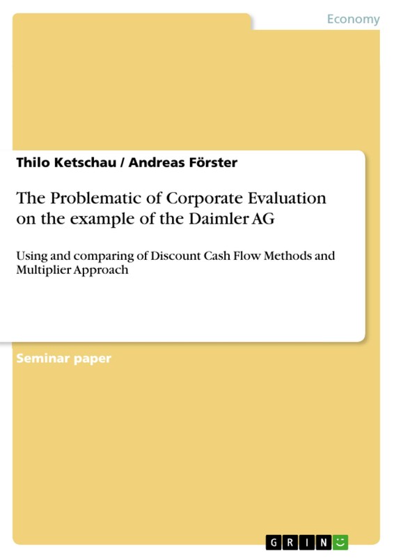 Seminar paper from the year 2013 in the subject Business economics - Investment and Finance, grade: 1,7, University of applied sciences, Cologne, course: Financial Management , language: English, abstract: The methods to evaluate the value of a company are numerous and diverse. In this assignment the theoretical framework of company evaluation is described and the popular approaches depending on discounted cash flows or multipliers are explained and used on the example of the Daimler AG. The different value results are discussed in the concluding part.