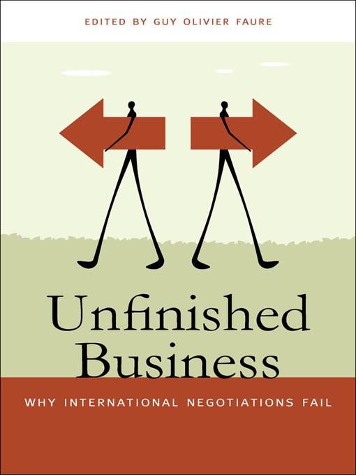 Most studies of international negotiations take successful talks as their subject. With a few notable exceptions, analysts have paid little attention to negotiations ending in failure. The essays in Unfinished Business show that as much, if not more, can be learned from failed negotiations as from successful negotiations with mediocre outcomes. Failure in this study pertains to a set of negotiating sessions that were convened for the purpose of achieving an agreement but instead broke up in continued disagreement.Seven case studies compose the first part of this the United Nations negotiations on Iraq, the Middle East Peace Summit at Camp David in 2000, Iran-European Union negotiations, the Cyprus conflict, the Biological Weapons Convention, the London Conference of 1830–33 on the status of Belgium, and two hostage negotiations (Waco and the Munich Olympics). These case studies provide examples of different types of failed bilateral, multilateral, and mediated (or trilateral). The second part of the book analyzes empirical findings from the case studies as causes of failure falling in four actors, structure, strategy, and process. This is an analytical framework recommended by the Processes of International Negotiation, arguably the leading society dedicated to research in this area. The last section of Unfinished Business contains two summarizing chapters that provide broader conclusions—lessons for theory and lessons for practice.